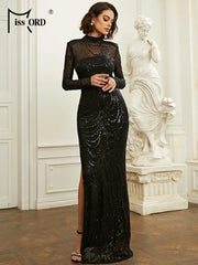 Missord Turtleneck Long Sleeve Split Sequin Red Maxi Dress Women's Bodycon Party Evening Dress Ladies Fashion Prom Dresses - Black / L