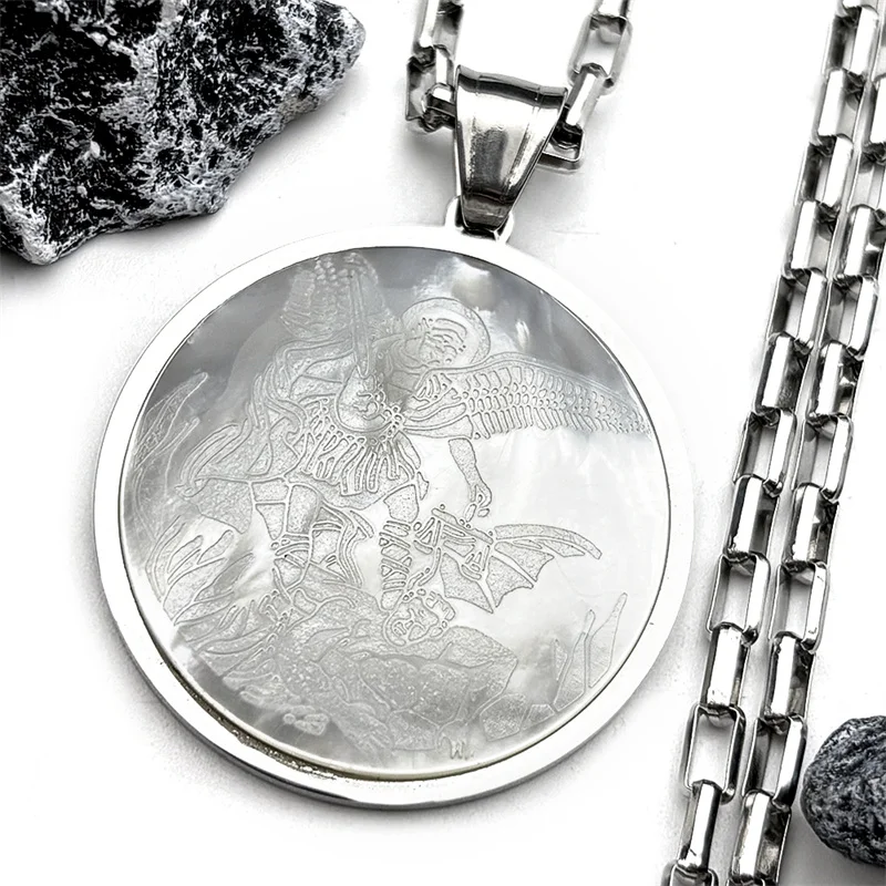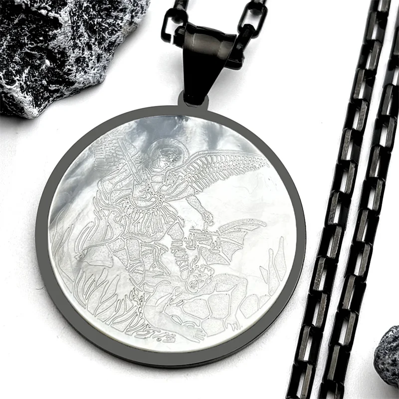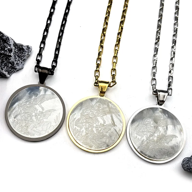 Archangel St.Michael Protect Us Shell Pendant Necklace for Women Men Stainless Steel Saint Michael Round Medal Chain Jewelry