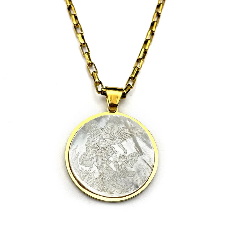 Archangel St.Michael Protect Us Shell Pendant Necklace for Women Men Stainless Steel Saint Michael Round Medal Chain Jewelry - GD