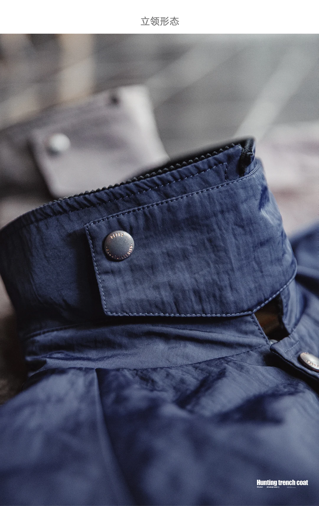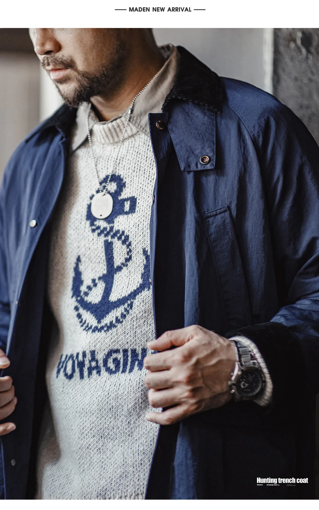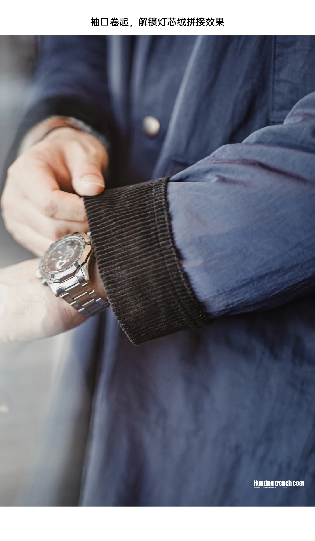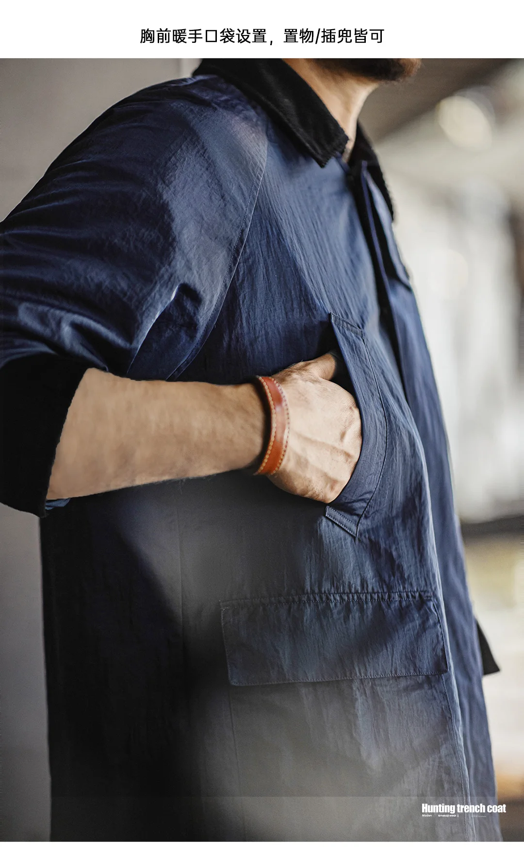Maden Retro Corduroy Lapel Safari Trench Coat Loose Fit Single-breasted Mid-length Versatile Jacket for Men's Spring and Autumn - Navy Blue / M