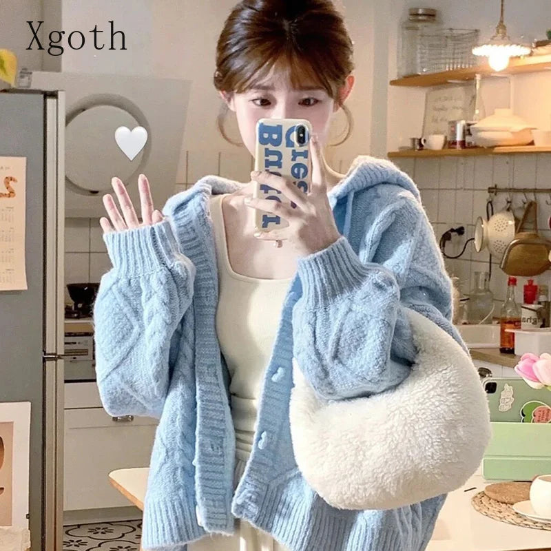 Spring and Autumn Horn-button Hooded Knit Sweater Coat Women Loose Outside Crop Top Gentle Soft Preppy Style White Cardigan - blue / L / CN