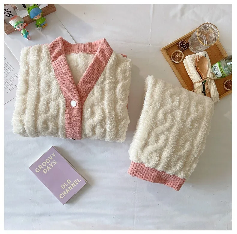 Thickened Warm Pink Peach Coral Velvet Pajamas 2PCS Set Winter Ladies Cardigan Nightwear Homewear Sweet Sleepwear Loungewear - White / L(42.5-65kg)